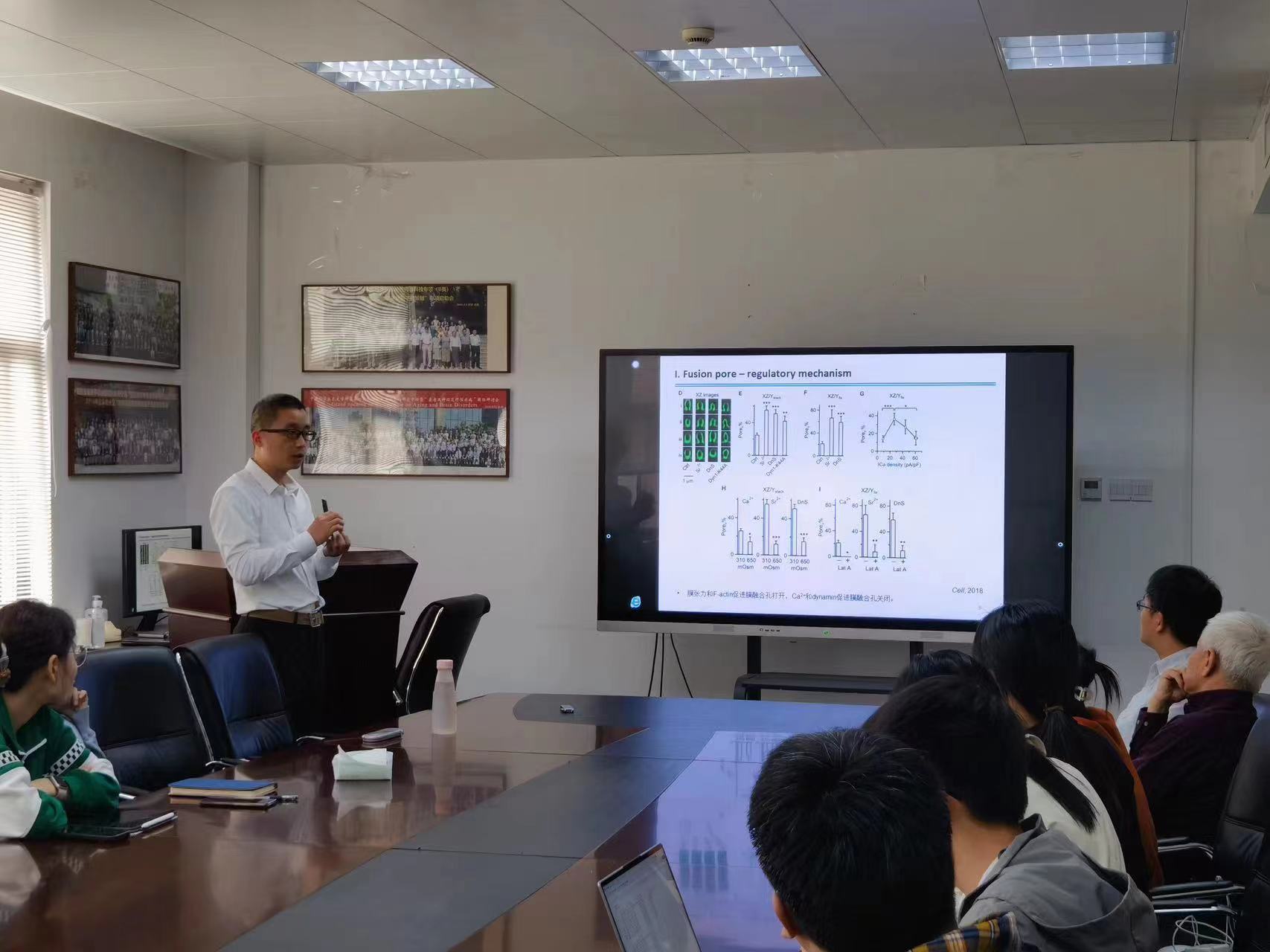 会上葛礼浩教授分享了他前期的研究工作, 科大师生就STED成像技术在囊泡释放和膜结构动态过程中的应用及相关科学问题进行了热烈的提问和探讨。大家对活细胞成像技术在细胞器互作研究的潜在前景进行了深入的探讨,一致认可超高分辨率成像技术在神经生物学研究中会起到越来越重要的作用。