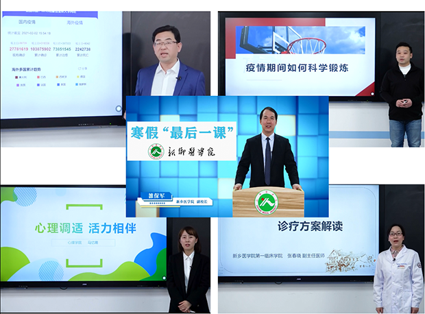 该课程共5次课,前期制作由教务处牵头组织,校党委委员、副校长雒保军教授领衔,公共卫生学院、心理学院、体育学院和第一临床学院共同配合完成。旨在帮助学生梳理本学期的学习生活,引导学生提高安全意识,做好科学防疫,指导学生做好假期规划,促使学生以良好的心态和积极的精神面貌投入到寒假学习生活中去,并度过充实而有意义的假期,让学生们“高高兴兴过寒假,平平安安回校园”。内容包括疫情防护教育、学业指导教育、身心健康教育、爱国主义教育等。