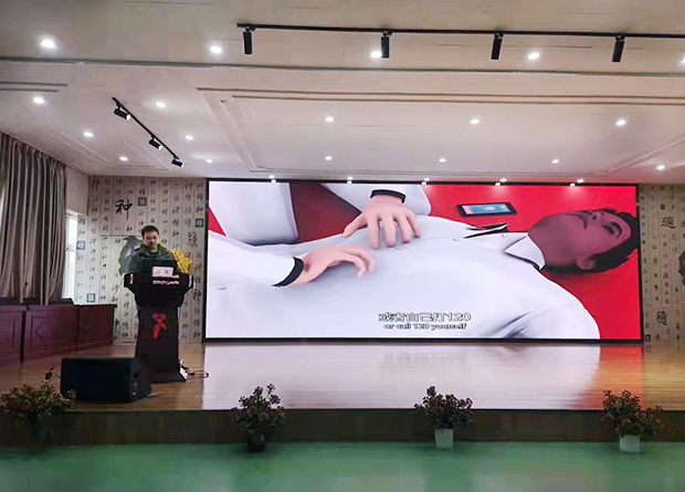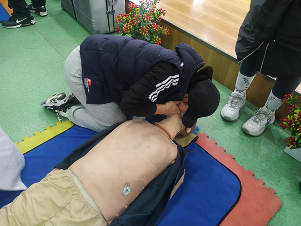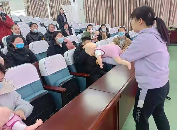 培训会上,郭浩老师用简洁的语言、生动的例子讲解了心脏复苏术、创伤急救、Heimlich急救法的理论知识和AED使用方法等急救知识和方法。讲解过后,参训教师一改平日身份,纷纷化身学生,在小教官的耐心指导下规范动作,并进行考核。