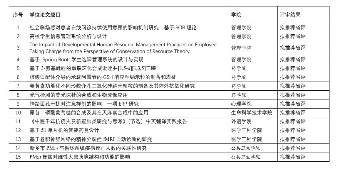 根据河南省教育厅办公室《关于开展2023年河南省优秀学位论文评选工作的通知》,教务部于2023年9月22-23日,组织专家对我校推荐的本科生优秀毕业论文进行评审,现将评审结果公示如下: