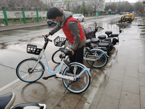 3月25日,“大学生志愿者”在北校区的自行车摆放点进行了巡查,将倒伏、摆放不规整的车辆重新摆放整齐。