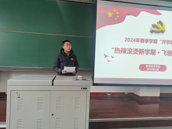 2月29日下午,在第三教学楼3104教室,医学技术学院召开了“开学第一课”主题班会。会议由团委书记尚鹏主持,学院党委副书记吴子钊、部分班主任老师以及全体在校学生参加。首先,程凡凡、李佳惠和杨振等三位同学结合个人的假期实践所见所闻所感,分享了践行党的二十大精神、立志成长为新时代好青年的思考和实践,并号召同学们坚定理想信念、涵养家国情怀、砥砺奋斗精神。然后,尚鹏围绕宿舍防火防盗、电动自行车文明骑行、预防电信诈骗等安全管理工作和宿舍6S管理等,向同学们进行了详细讲解并提出明确要求。之后,班主任代表王琼梓老师、张黎琛老师分别发言,她们表达了对同学们返校的欢迎,同时也对校园安全、专业学习、职业规划等向同学们提出了要求和期许。最后,医学技术学院党委副书记吴子钊做总结讲话,他从理想信念、习惯养成、人际交往、纪律安全等几方面提出具体要求,并寄语同学们能够快乐成长,学业有成,成为一名名副其实的新时代好青年。