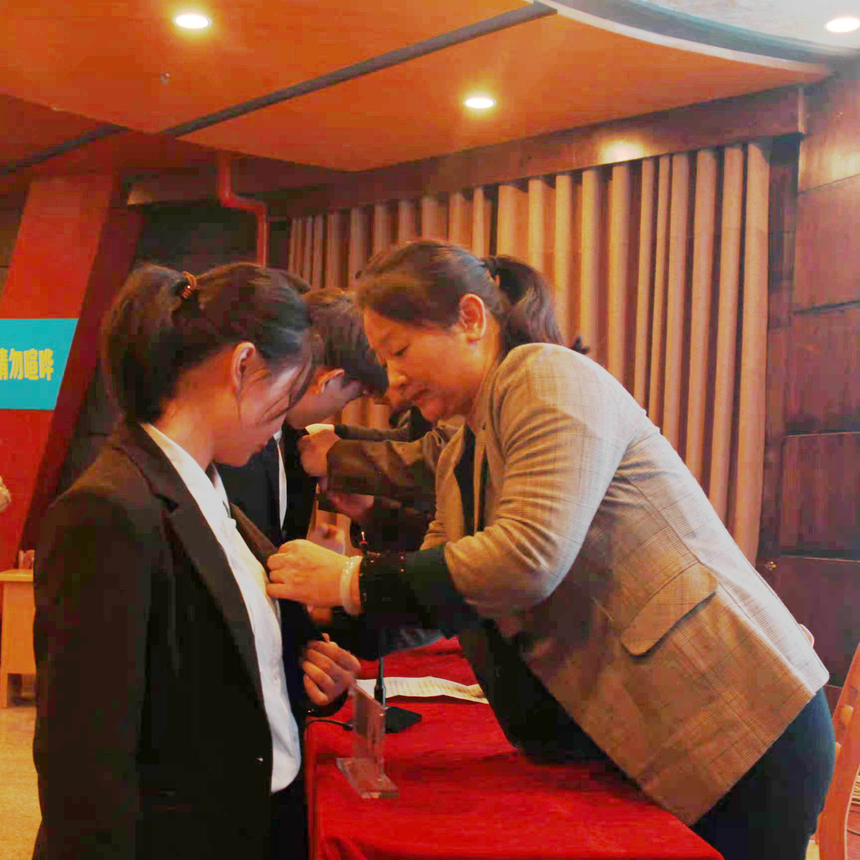 在优美的旋律中,学院领导为学生代表佩戴校徽。