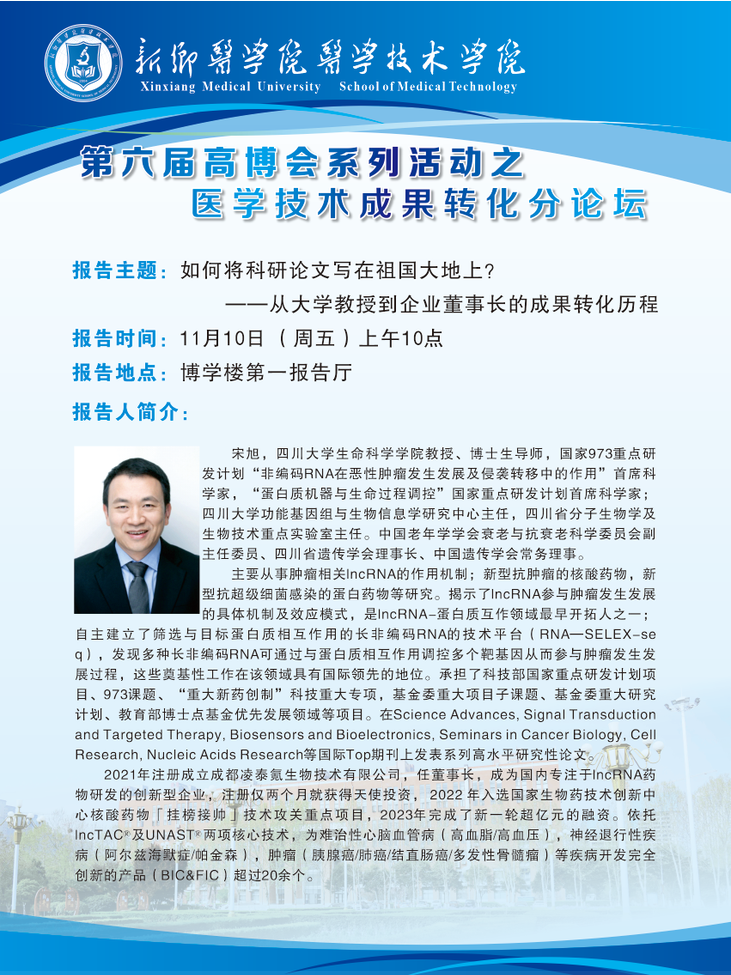 宋旭,四川大学生命科学学院教授、博士生导师,国家973重点研发计划“非编码RNA在恶性肿瘤发生发展及侵袭转移中的作用”首席科学家,“蛋白质机器与生命过程调控”国家重点研发计划首席科学家;四川大学功能基因组与生物信息学研究中心主任,四川省分子生物学及生物技术重点实验室主任。中国老年学学会衰老与抗衰老科学委员会副主任委员、四川省遗传学会理事长、中国遗传学会常务理事。