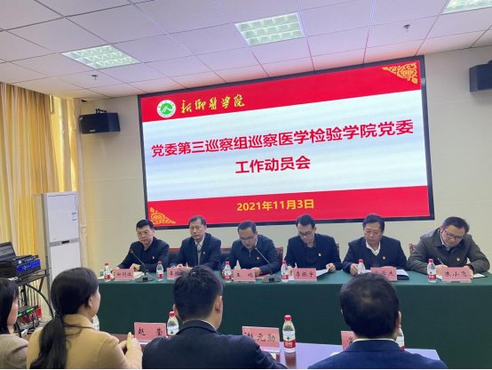 11月3日上午,党委第三巡察组巡察医学检验学院党委工作动员会在科技楼404会议室召开,巡察组组长王鹏同志及巡察组成员一行8人出席会议,学院班子成员、党支部书记、科级干部、高级职称教师及教师、学生代表参加会议。医学检验学院党委书记白剑波主持会议。