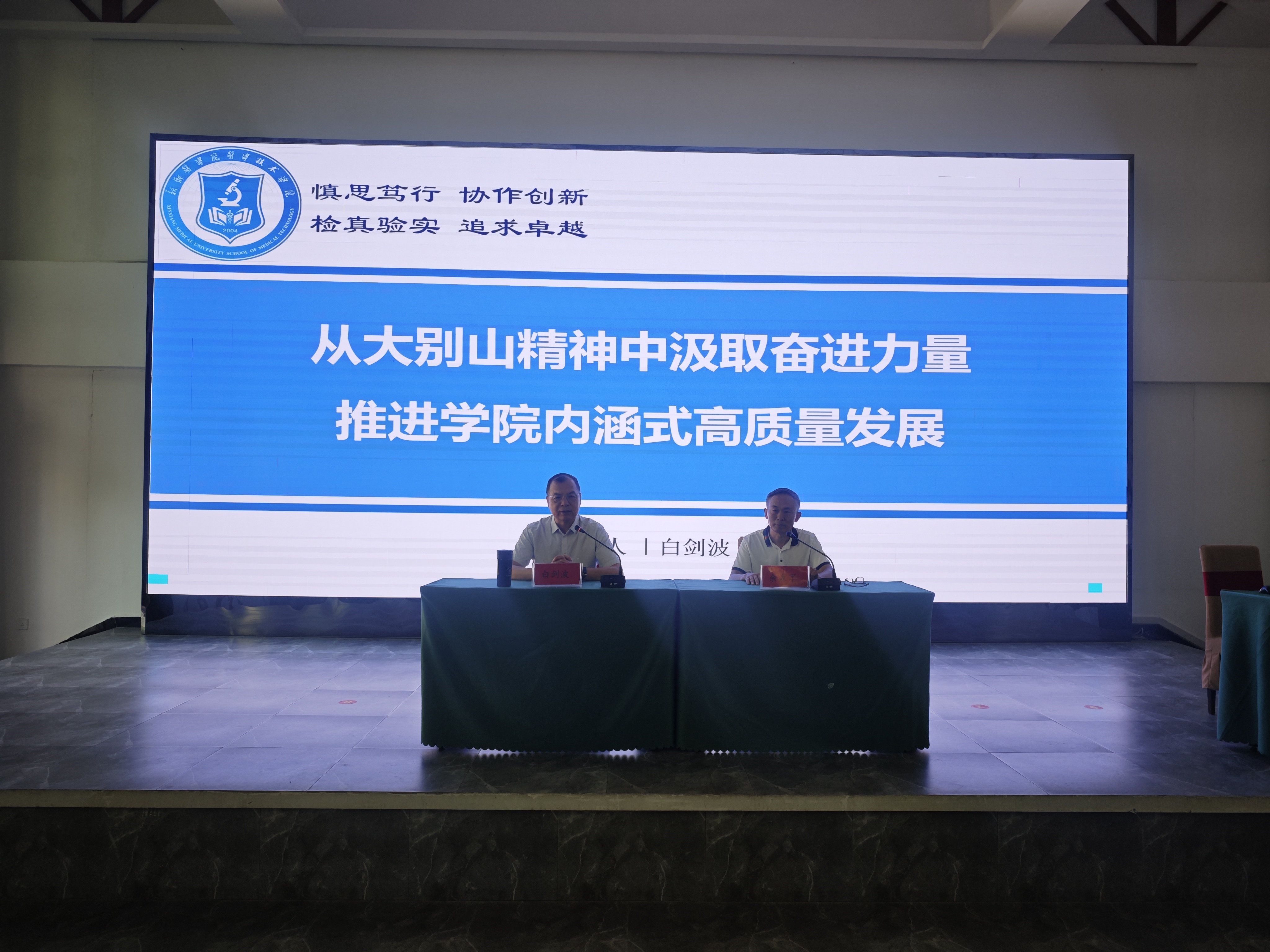 随后,学院党委书记白剑波以《从大别山精神中汲取奋进力量 推进学院内涵式高质量发展》为题,为全体党员干部作首场报告。他以习近平总书记在党的二十届三中全会上的重要讲话开篇,从深入领会全会的重大意义、进一步全面深化改革的重大举措等方面,进行了系统宣讲,使大家认识到新时代推进事业发展对党员干部能力素质要求。接着,他从“坚守信念、对党忠诚”、“依靠群众、团结奋斗”、“不畏牺牲、无私奉献”、“胸怀大局、勇当先锋”四个方面深入阐述了大别山精神的内涵与时代价值。最后,他分析了当前学校、学院发展面临的严峻形势,要求全体党员同志发扬斗争精神、增强斗争本领,紧盯学院全面深化改革任务和内涵式高质量发展目标,坚持一切从实际出发,明确自身定位,大力推进对标攻关,找准切入点、突破口,大力推动学院高质量发展。