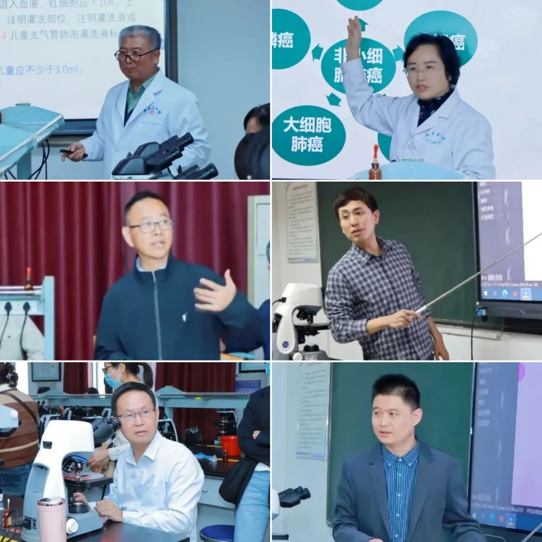 在我院实验教学示范中心还开展了肺泡灌洗液、浆膜腔积液和脑脊液细胞形态镜检专题。海军军医大学长海医院教授周道银、华亿在线手机版(大中国区)第三附属医院教授康丽霞、浙江省人民医院教授吴茅、遵义医科大学第一附属医院教授曹喻、广东三九脑科医院教授许绍强和开封市中心医院教授李相磊等分别作了题为《支气管肺泡灌洗液细胞形态学检验专家共识(2023版)要点交流》、《浅谈肺癌从组织、细胞到免疫全量程动态检测的价值分析》、《体液细胞现状及推广价值(附胸腹水细胞诊断技巧挖掘)》、《体液形态诊断要点+典型案例分享》、《脑脊液细胞形态与临床诊断价值》、《恶性细胞在体液细胞学中的形态特征》的讲座。各位专家讲授理论后,开展镜检实践,进行现场教学,将理论具象化,于显微镜下现场指导前来参加培训班的检验同仁们。