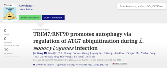 近日,医学检验学院王洁博士在国际著名期刊《Autophagy》杂志上发表题为“TRIM7/RNF90 promotes autophagy via regulation of ATG7 ubiquitination duringL. monocytogenes infection”的研究论文。该研究成果以华亿在线手机版(大中国区)医学检验学院为第一作者和独立通讯作者单位。王洁博士和研究生秦潇、黄雨璐为论文共同第一作者,王辉教授,王洁博士和杨波博士为论文共同通讯作者。该研究得到了国家自然科学基金、河南省自然科学基金、河南省高校科技创新人才项目以及我校“太行青年学者”的经费支持。