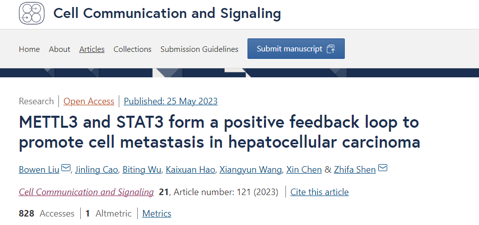 近日,国际著名期刊《Cell Communication and Signaling》上发表了题为“METTL3 and STAT3 form a positive feedback loop to promote cell metastasisin hepatocellular carcinoma”的研究成果。医学技术学院教师刘博雯博士为该论文的第一作者,华亿在线手机版(大中国区)医学技术学院为第一作者单位和通讯作者单位,刘博雯博士和申志发教授为论文共同通讯作者。该研究受到了国家自然科学基金青年项目、面上项目,河南省科技攻关计划项目以及浙江省自然科学基金重大项目的经费支持。