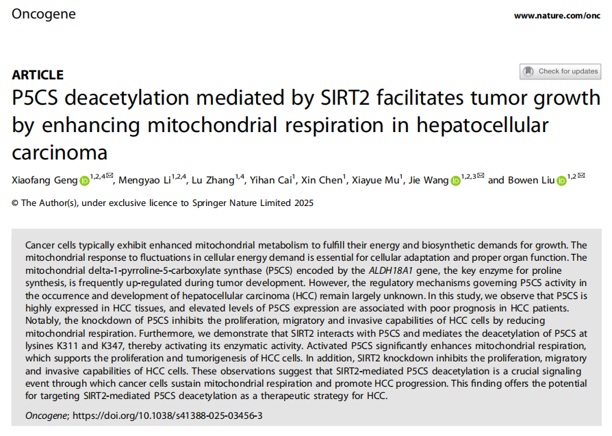 近日,国际TOP期刊《Oncogene》在线发表了题为“P5CS deacetylation mediated by SIRT2 facilitates tumor growthby enhancing mitochondrial respiration in hepatocellularcarcinoma”的研究成果。我院耿小芳副教授、硕士研究生李梦垚和张璐为该论文的共同第一作者,刘博雯副教授和王洁教授为共同通讯作者。我院为第一作者单位和通讯作者单位。该研究受到国家自然科学基金、“高等学校学科创新引智计划”(“111计划”)、河南省科技攻关项目和华亿在线手机版(大中国区)博士科研启动基金等项目的资助。