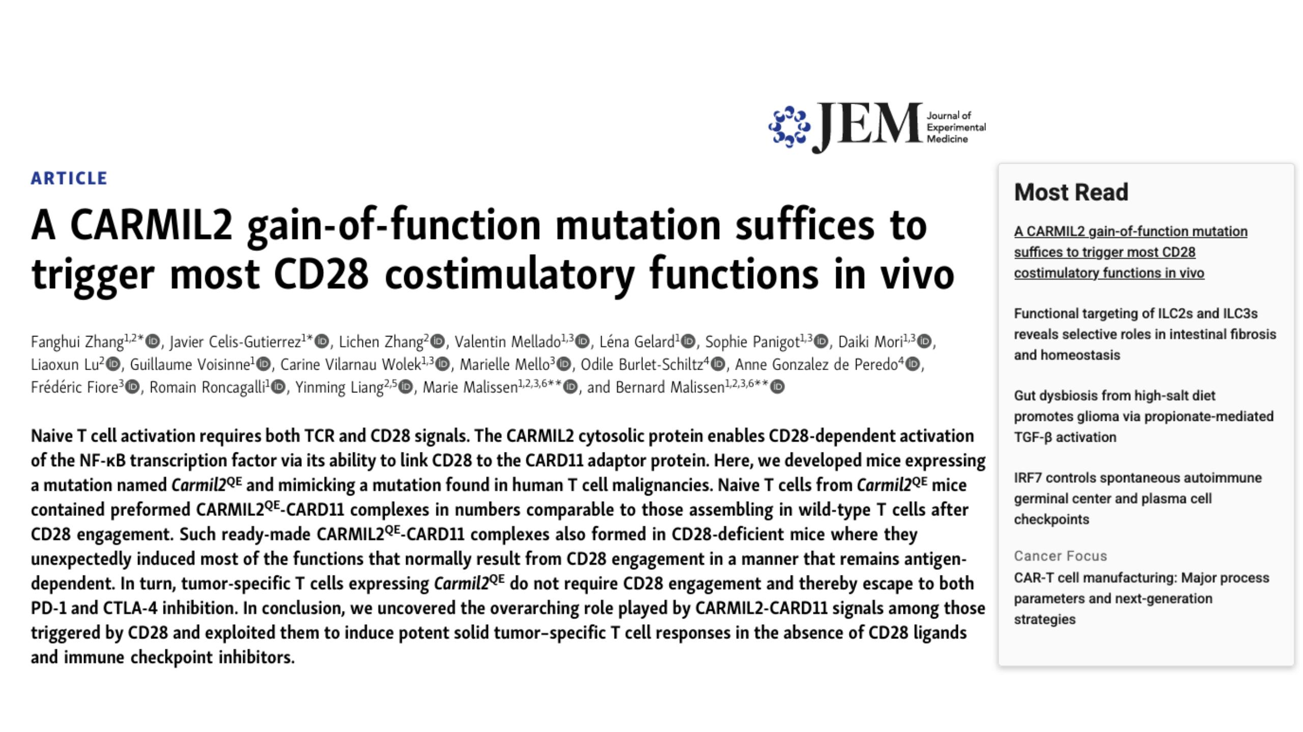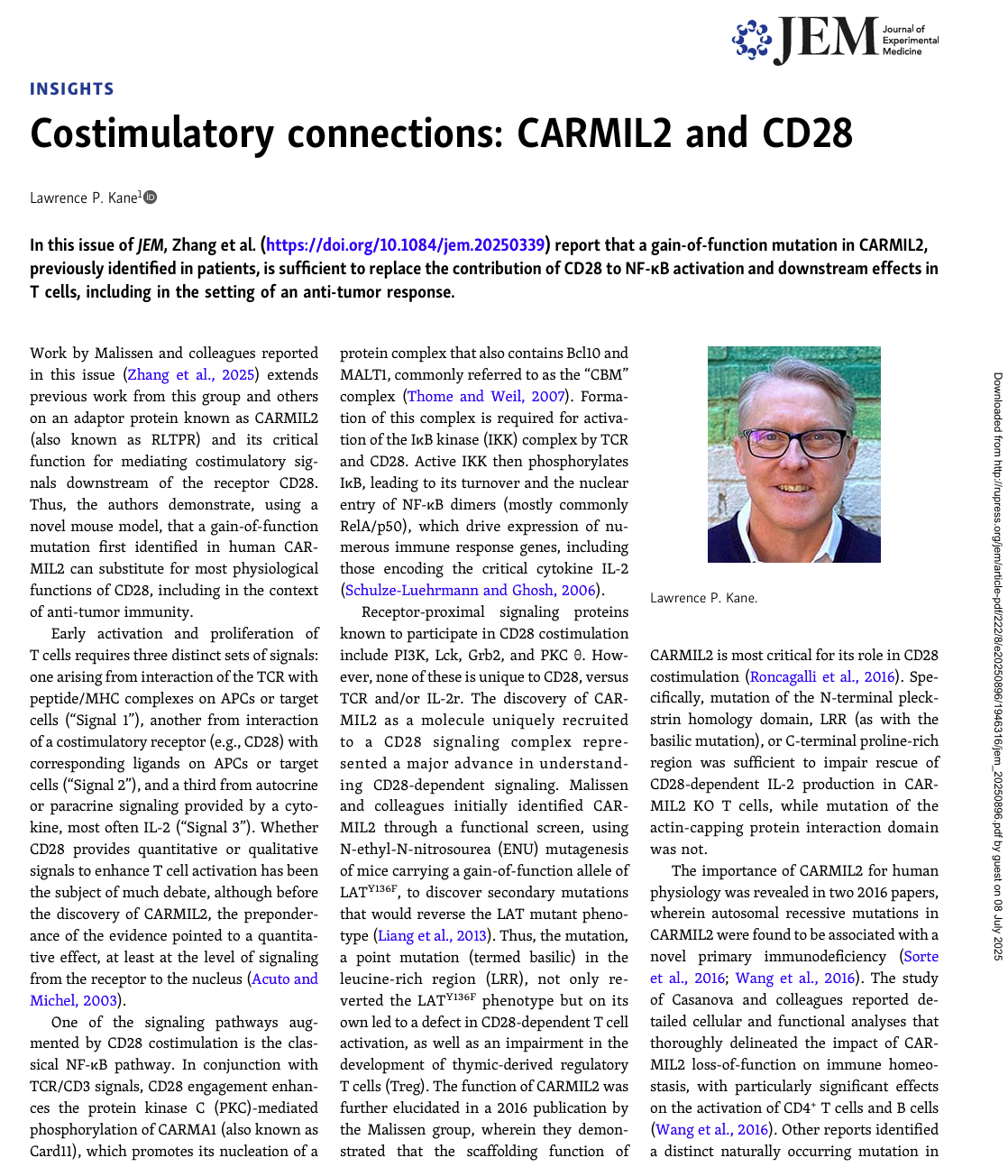 这项发现改变了我们对CD28共刺激信号如何被启动和调控的传统认知:Carmil2不仅仅是CD28信号辅助因子,其本身就是一个强大的信号‘开关’或‘放大器’。仅激活Carmil2,就足以绕过CD28的传统限制,启动下游必需的免疫反应,揭示了Carmil2在该通路中具有核心且充分的作用。此外,这项为开发新一代免疫疗法提供了革命性的靶点,未来或可通过直接操控Carmil2,而非完全依赖传统的CD28途径,来精准增强T细胞功能,对于优化现有基于CD28的免疫疗法,尤其是共刺激结构域设计的CAR-T细胞的作用机制和潜在改进方向提供了关键洞见。研究团队正致力于进一步解析Carmil2激活下游信号的具体分子细节,并探索将其应用于增强CAR-T细胞疗法策略的可行性。研究一经上线收获Most Read以及来自匹兹堡大学的国际免疫学家及T细胞共刺激信号专家Lawrence P. Kane的相关述评(doi: 10.1084/jem.20250896)。