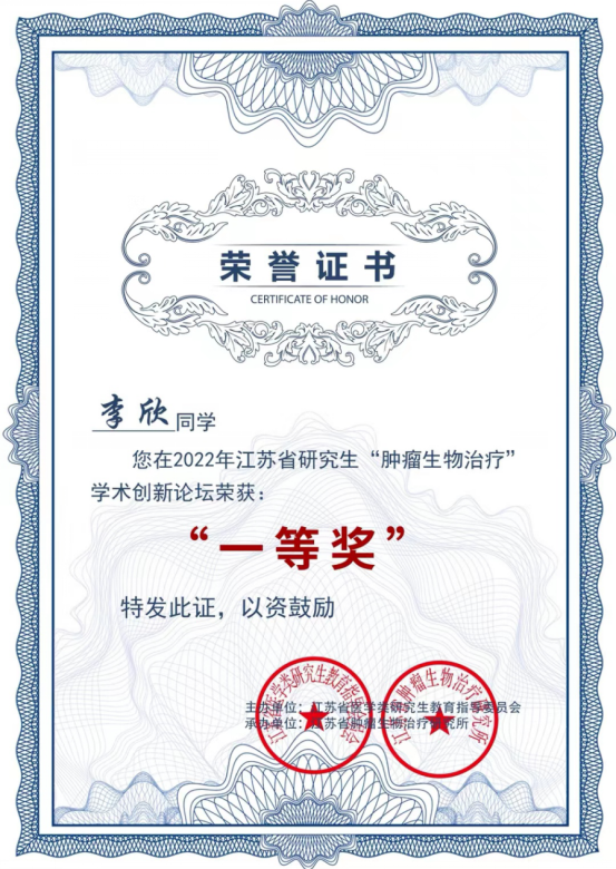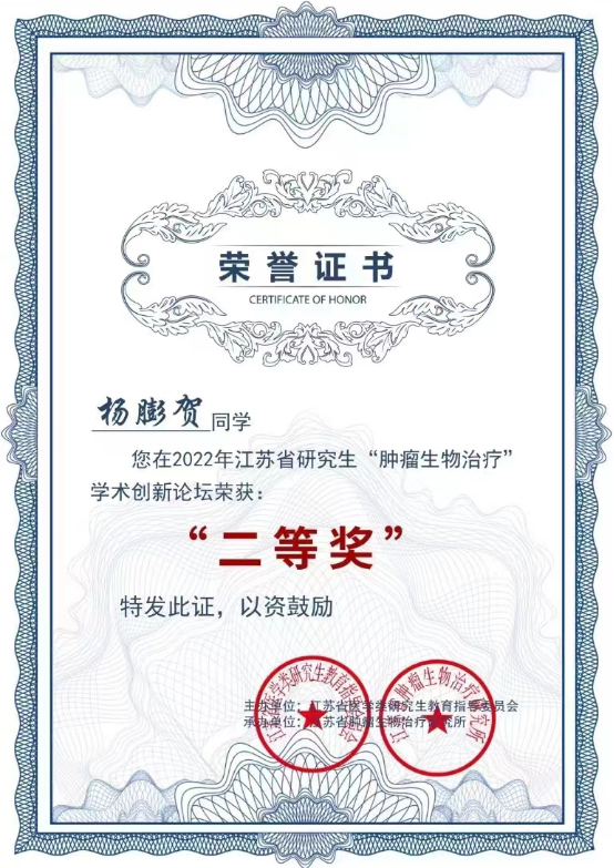 2022年10月15日,由江苏省医学类研究生教育指导委员会主办,徐州医科大学和江苏省肿瘤生物治疗研究所承办的2022年江苏省研究生“肿瘤生物治疗”学术创新论坛在徐州落下帷幕。此次论坛,医学检验学院研究生取得一等奖1项,二等奖2项的优异成绩。