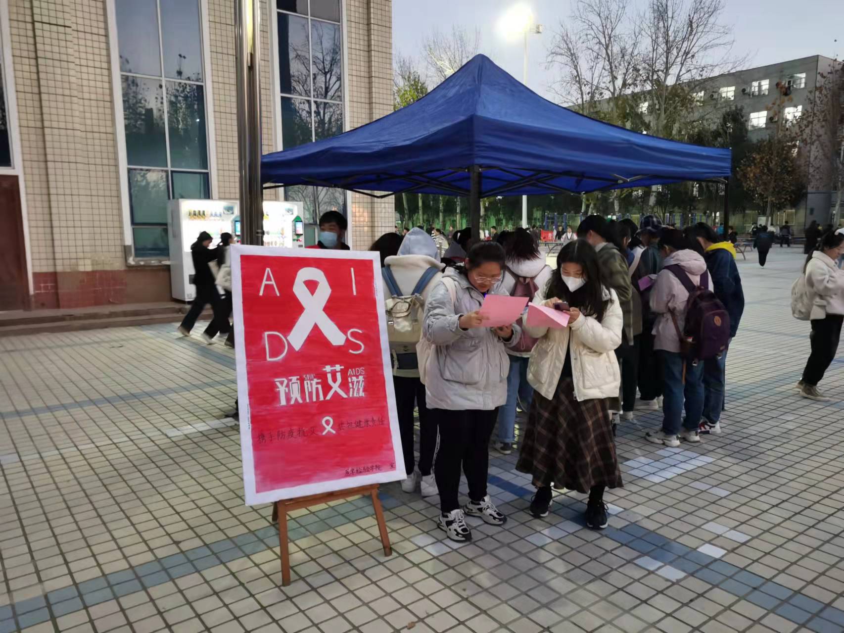 2021年12月1日下午,凛冽的寒风挡不住大家的热情,志愿者们来到学校南校区五环广场,通过摆放宣传展板、散发宣传册、面对面宣讲、有奖问答等形式,共发放了1000余份防艾知识宣传页,向在校师生广泛宣传了艾滋病防治的相关知识。