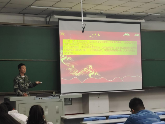 出彩青春,逐梦军营,为扎实做好2022年度大学生征兵工作,提高广大学生的应征入伍的热情,按照学校《关于开展2022年度征兵宣讲活动的通知》要求,2021年11月22日晚,医学检验学院组织2021级全体新生,在3302教室参加了学校武装部安排的大学生征兵政策宣讲活动。活动邀请我校学生——退役士兵肖杰进行宣讲。