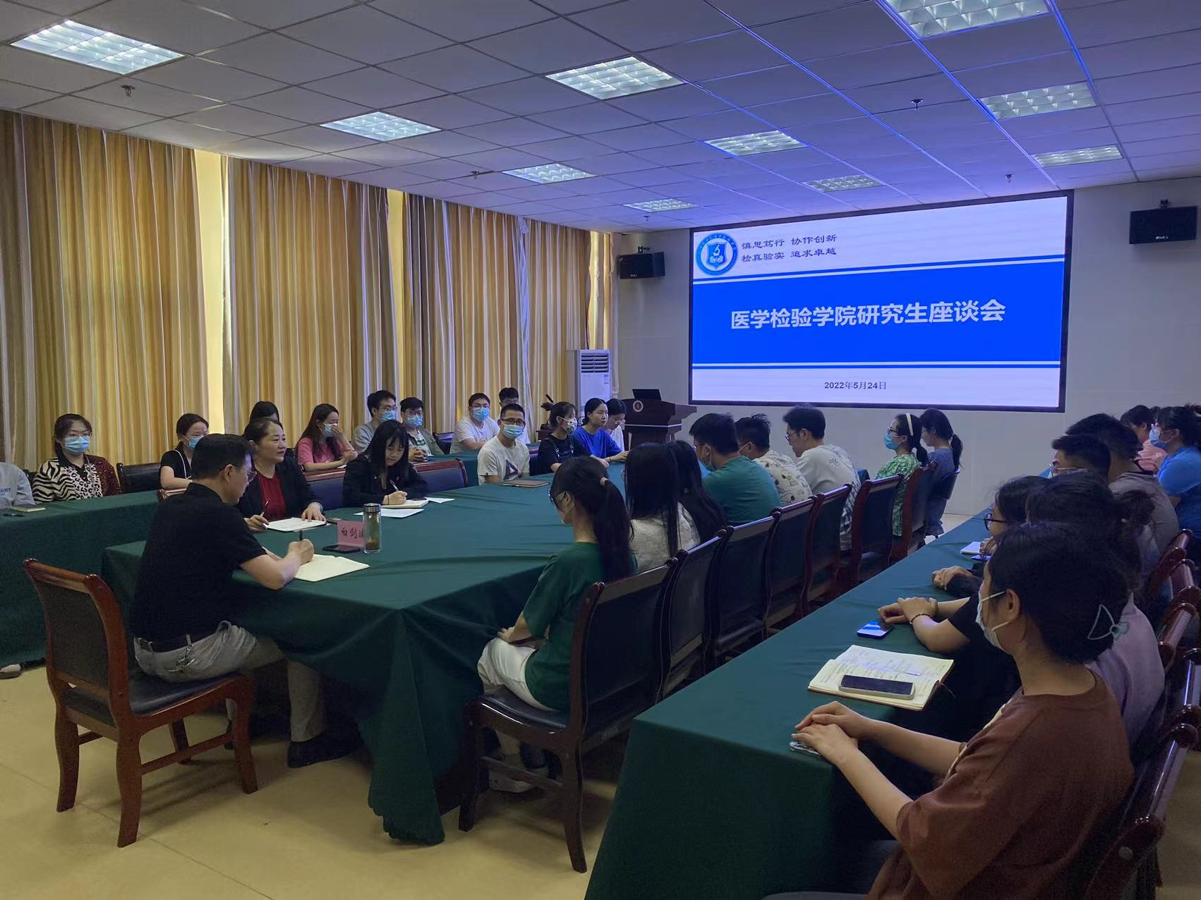 为了深入贯彻习近平总书记关于疫情防控工作的指示批示精神,扎实落实省委和学校党委关于疫情防控和安全稳定工作会议精神,精准了解研究生学习生活、科研和心理健康情况,5月24日下午,我院在科技楼404会议室召开医学检验学院研究生座谈会。学院党委书记白剑波、副院长张晨光、研究生管理人员、兼职辅导员和在校的40多位研究生参加了座谈会。