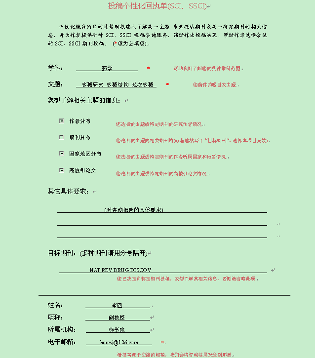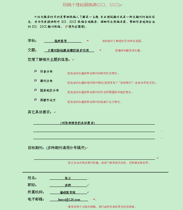 由于网站群不允许动态交互,所以如果您愿意使用此服务,请您下载附件中的“投稿个性化回执单.doc”文件并认真填写,然后通过邮箱发送给我们(hnrcsj@126.com),我们将及时免费地向您发送咨询报告,填写要求请参见附件。如遇问题或建议,请联系我们。