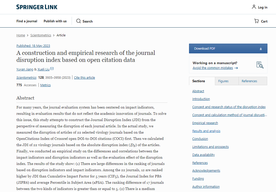 近日,以河南省科技期刊研究中心2021级硕士研究生姜育彦为第一作者,河南省科技期刊研究中心硕士研究生导师刘雪立教授为通讯作者,在科学计量学领域权威期刊Scientometrics发表了题为“A construction and empirical research of the journal disruption index based on open citation data”(基于开放引文数据的期刊颠覆性指数构建及实证研究)的研究成果。