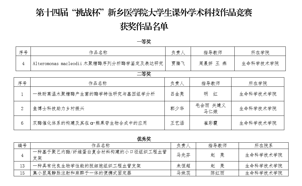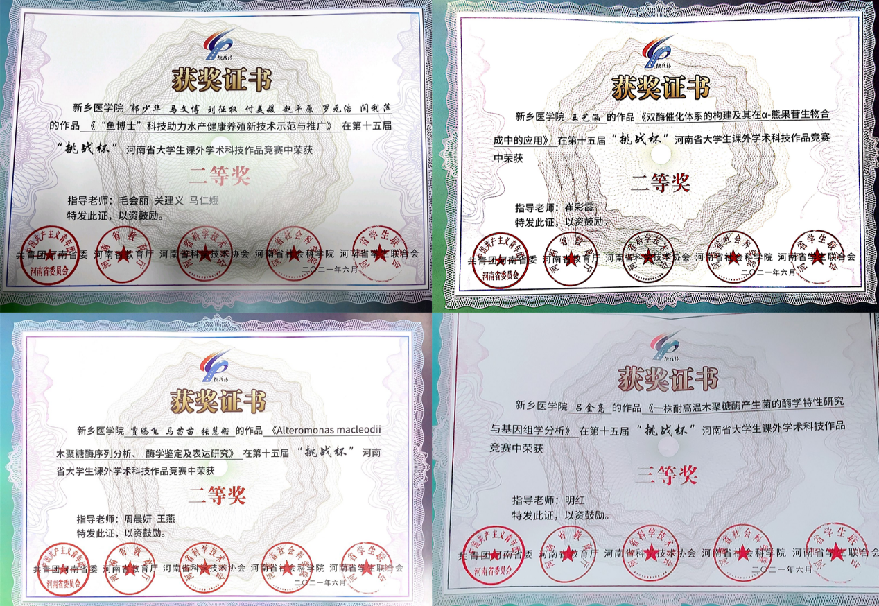 我院高度重视“挑战杯”竞赛工作,积极宣传、广泛发动我院师生,精心准备比赛。我院数十名学生共15项作品参加了我校“挑战杯”赛的角逐,经过学校初审共有7项作品进入决赛。在终审答辩阶段,学校组织专家组现场听取作品主持人的汇报、并进行提问与答辩。经过激烈角逐我院7项作品均获奖,其中,一等奖1项,二等奖3项,优秀奖3项。其中部分优秀获奖作品被学校推荐参加河南省十五届“挑战杯”大学生课外学术科技作品竞赛的角逐,我院学子荣获省级二等奖3项、省级三等奖1项。我院也因出色的组织工作与优异的比赛成绩最终夺得了学校杯赛的集体最高奖——“挑战杯”。