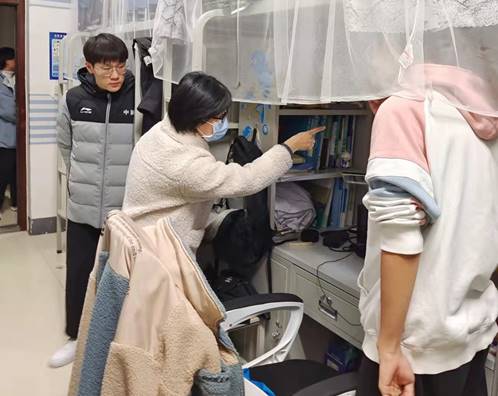 一行人先后到第七学生公寓和第八学生公寓进行检查,重点对宿舍防火、卫生等进行了检查和督导。对发现的问题,如插座连接过多,充电器、台灯等电子产品用后及时关闭并切断电源等问题,一一指出,并当场整改。随后庞强强还强调,要注重宿舍卫生,及时清扫垃圾,保持地面整洁,创造干净舒适的生活环境;遵守学校规定,不可以私自外宿、违规留宿人员。临近期末考试,他还提醒同学们放平心态,诚信为本,以积极昂扬的精神状态迎接考试。此次检查,庞强强不仅指出了部分寝室的用电不良习惯和卫生问题,更是对整洁干净的宿舍进行了表扬,鼓励同学们继续保持好的优秀生活习惯。