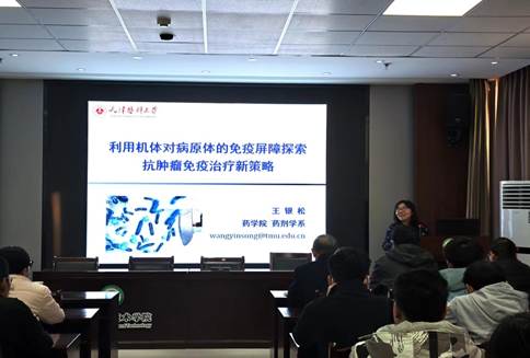 王银松教授以“利用机体对病原体的免疫屏障探索抗肿瘤免疫新策略”为题,从肿瘤免疫治疗、病原体的免疫屏障及多功能光热凝胶治疗致病菌定植的口腔鳞状细胞癌等方面介绍了她的最新研究成果。在座的老师和研究生对致病菌定植的生物安全性相关学术问题与王教授进行了深入的探讨和交流。