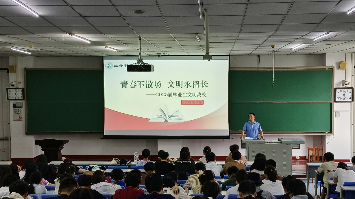 为引导毕业生以文明素养诠释责任担当,将文明离校作为感恩母校的第一次实践课堂,生命科学技术学院党委副书记庞强强于6月13日下午四点半在3301教室主持召开了文明离校主题教育活动,我院2021级和2022级全体学生参与此次会议,庞书记强调文明离校是毕业生对母校的“最后一份贺礼”,也是步入社会的“第一张明信片”。