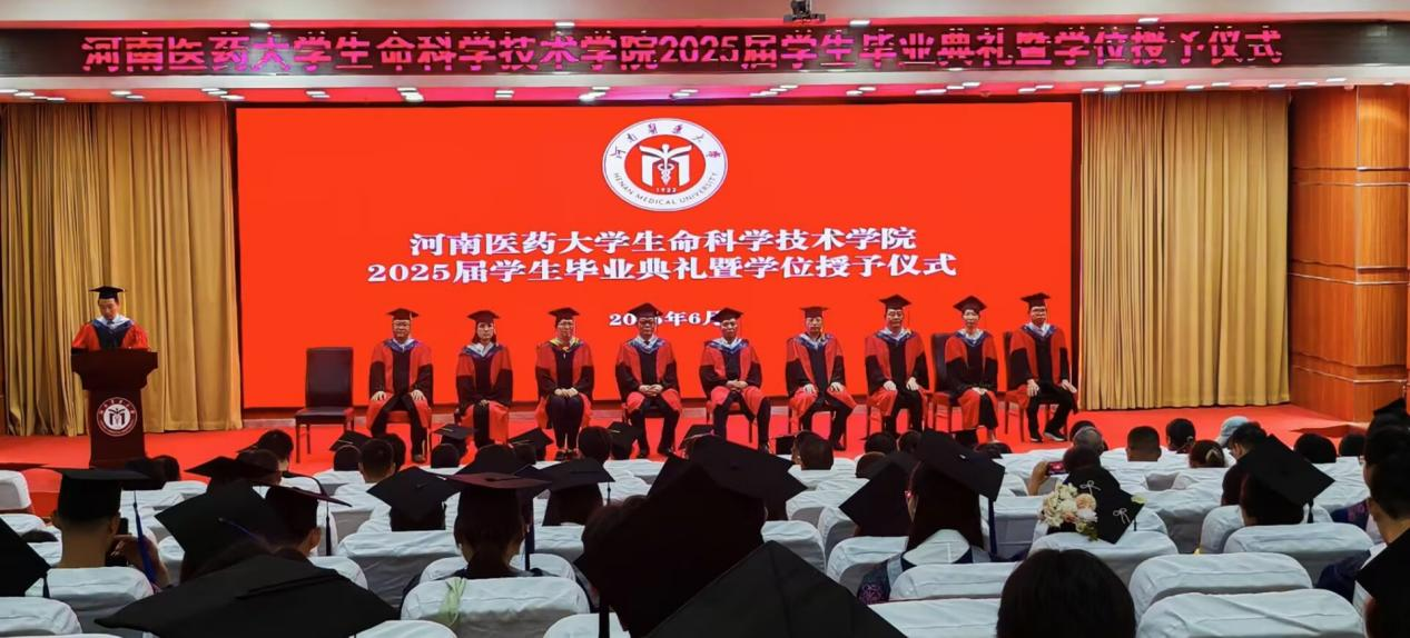 6 月 20 日,河南医药大学生命科学技术学院 2025 届学生毕业典礼暨学位授予仪式在第一报告厅隆重举行。学院领导班子、学院学位评定分委员会委员在主席台就坐。教师代表、辅导员老师、2025届全体硕士毕业生、本科毕业生及在校生代表参加典礼。毕业典礼由学院党委副书记庞强强主持。