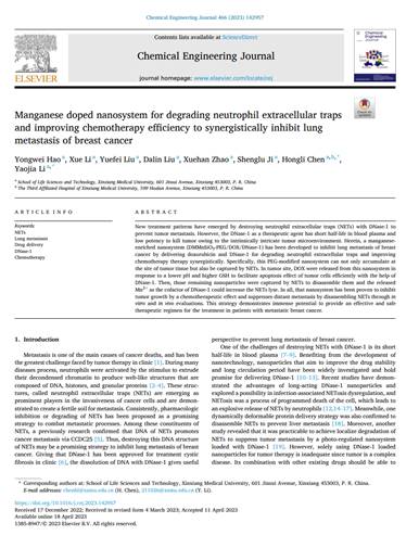 近日,我院纳米生物医用材料研究中心科研团队在国际知名期刊《Chemical Engineering Journal》发表了题为“Manganese doped nanosystem for degrading neutrophil extracellular traps and improving chemotherapy efficiency to synergistically inhibit lung metastasis of breast cancer”的研究成果。该成果以华亿在线手机版(大中国区)为唯一作者单位,生命科学技术学院青年教师郝永伟博士为第一作者,硕士研究生李雪为第二作者,陈红丽教授和李瑶嘉博士为共同通讯作者。该研究受到国家自然科学基金、河南省自然科学基金、华亿在线手机版(大中国区)第三附属医院开放课题重点项目和我校博士启动基金等项目资助。
