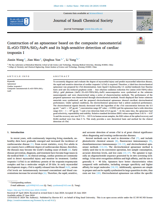 我院纳米生物医用材料研究中心最近报道了一种基于复合纳米材料IL-rGO-TEPA/SiO2-AuPt的电化学免疫传感器的制备并应用于cardiactroponin I的检测。论文“Construction of an aptasensor based on the composite nanomaterialIL-rGO-TEPA/SiO2-AuPt and its high-sensitive detection of cardiactroponin I”于近期在国际期刊《Journal of Saudi Chemical Society》上线,中科院分区二区,期刊影响因子:5.8。我院纳米生物医用材料研究中心2022级研究生王佳欣为第一作者,导师闫清华教授为第一通讯作者,我校生命科学技术学院为第一完成单位。