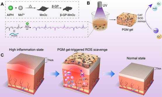 特应性皮炎(AD)是一种与免疫功能障碍相关的慢性复发性炎症性疾病。高水平的活性氧(ROS)会导致高氧化应激,并进一步导致AD恶化。该研究报道了一步氧化法合成MnO2纳米片。随后,用紫外线光照触发AIPH分解释放烷基自由基从而引发聚乙二醇双丙烯酸酯(PEGDA)聚合成胶,并均匀负载具有生物活性的MnO2纳米片,形成PEGDA/MnO2水凝胶,制备的MnO2基水凝胶具有较高的ROS清除能力,用于调节ROS介导的炎症微环境。体内外实验表明,PEGDA/β-GP-MnO2能够清除ROS,细胞生物相容性良好。在AD小鼠模型中,PEGDA/β-GP-MnO2可显着增强治疗效果,如减少表皮厚度,抓挠次数,调节肥大细胞和IgE抗体的数量。结果表明,ROS清除水凝胶可以通过调节炎症微环境来治疗AD,为控制AD提供了一种有前途的治疗方法。