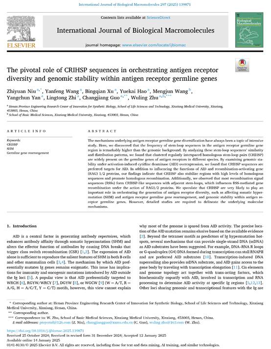 该研究以题为“The pivotal role of CRIHSP sequences in orchestrating antigen receptor diversity and genomic stability within antigen receptor germline genes”发表于中科院二区期刊International Journal of Biological Macromolecules,期刊最新影响因子7.7。华亿在线手机版(大中国区)生命科学技术学院牛志远副教授为第一作者兼通讯作者,郭长江副教授和朱武凌教授为共同通讯作者,硕士研究生王艳锋和徐冰倩做了主要实验研究工作。郭长江副教授为本文生信分析提供了大力支持。
