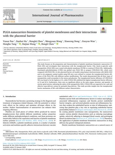 近日,我院纳米生物医用材料研究中心陈红丽教授团队在国际期刊International Journal of Pharmaceutics上发表了题为“PLGA Nanocarriers Biomimetic of Platelet Membranes and Their Interactions with the Placental Barrier”的研究论文。我院2021级和2020级硕士研究生潘玉雪和胡丹慧为该论文的第一、第二作者,首都医科大学附属北京妇产医院唐红波主任药师,我院纳米生物医用材料研究中心王海蛟博士与陈红丽教授为共同通讯作者,我院为第一单位。研究得到了河南省国际科技合作项目,河南省科技攻关项目及国家自然科学基金项目的资助。