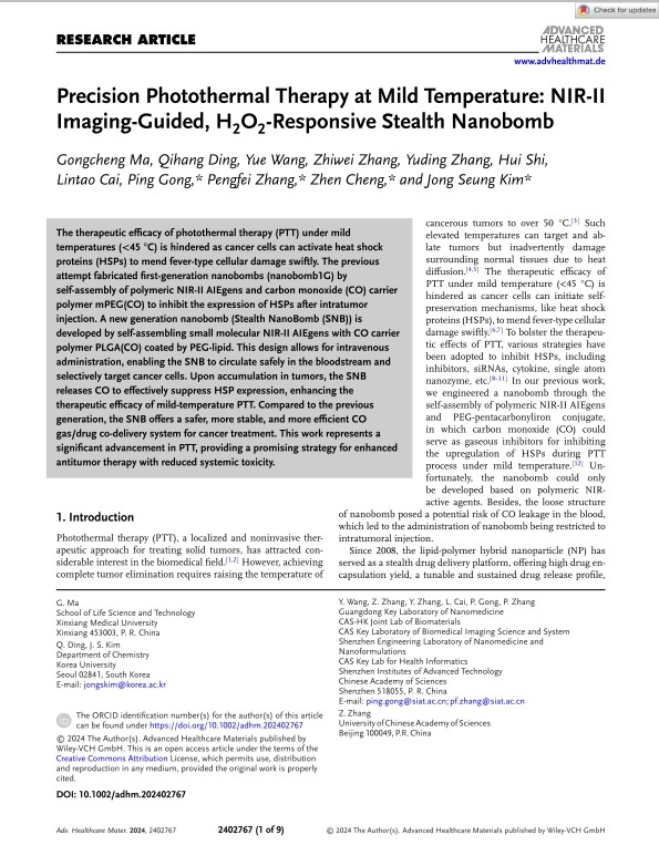 该研究以题为“Precision Photothermal Therapy at Mild Temperature: NIR-II Imaging-Guided, H2O2-Responsive Stealth Nanobomb”发表于中科院二区期刊Advanced Healthcare Materials,并被录用为封面文章,期刊最新影响因子10.0,中科院深圳先进技术研究院龚萍研究员、张鹏飞副研究员、中科院上海药物所程震教授和高丽大学Jong Seung Kim教授为本文的通讯作者,青年教师马功成博士为第一作者。