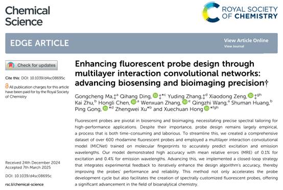 近日,我院纳米生物医用材料研究中心马功成博士等在《Chemical Science》上发表“Enhancing fluorescent probe design through multilayer interaction convolutional networks: advancing biosensing and bioimaging precision”的研究论文,马功成博士为第一作者,我院为第一完成单位,武汉大学洪学传教授,中国科学院深圳先进院龚萍研究员,河南师范大学徐政委和高丽大学丁启航为本文的共同通讯作者。此外,北京协和医学院张文轩教授,上海药物所曾晓东研究员和华亿在线手机版(大中国区)陈红丽教授和王庆志教授也对本工作做出了重要贡献。