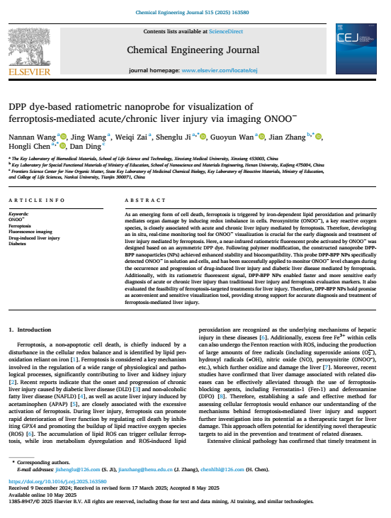 近日,我院纳米生物医用材料研究中心王楠楠博士等在《Chemical Engineering Journal》上发表“DPP dye-based ratiometric nanoprobe for visualization of ferroptosis-mediated acute/chronic liver injury via imaging ONOO−”的研究论文,王楠楠博士为第一作者,我院为第一完成单位,河南大学张健副教授,我院姬盛路副教授和陈红丽教授为本文的共同通讯作者。南开大学丁丹教授和我院万国运副教授也为本工作做出了重要贡献,研究生王静和宰伟旗为第二和第三作者。
