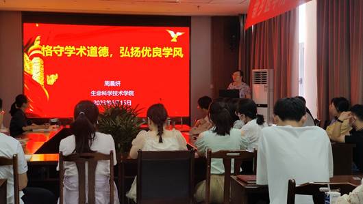 6月15日上午,生命科学技术学院副院长周晨妍以“恪守学术道德,弘扬优良学风”为题,为我院全体研究生讲授主题教育专题党课。