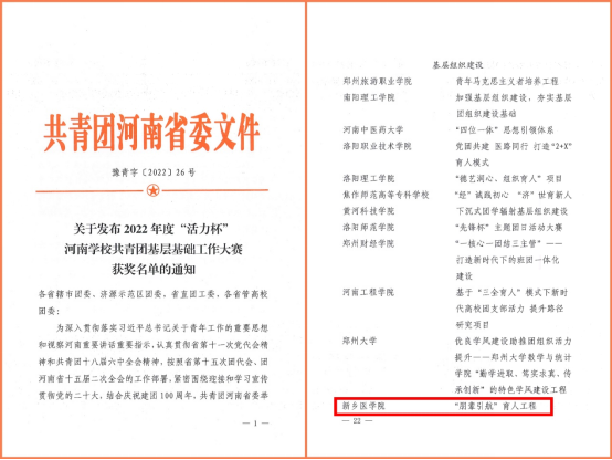近日,共青团河南省委发布了《关于2022年度“活力杯”河南学校共青团基层基础工作大赛获奖名单的通知》(豫青字【2022】26号),我院“朋辈引航”育人工程荣获高校组基层组织建设模块三等奖