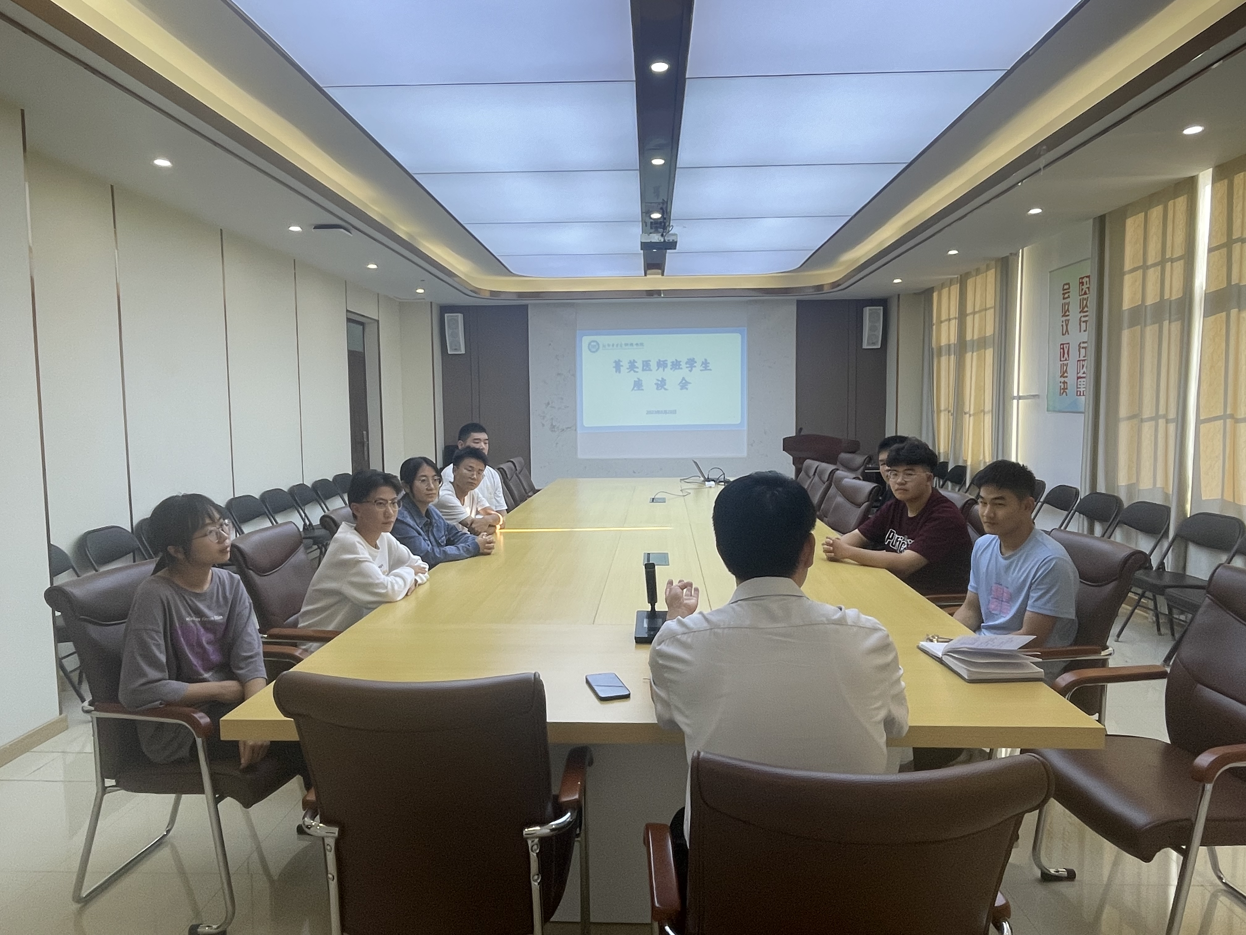 2023年8月29日,菁英医师班学生座谈会在明德书院会议室召开,书院党委书记王正晓、团委副书记高伟和学生代表参加会议,会议由高伟主持。