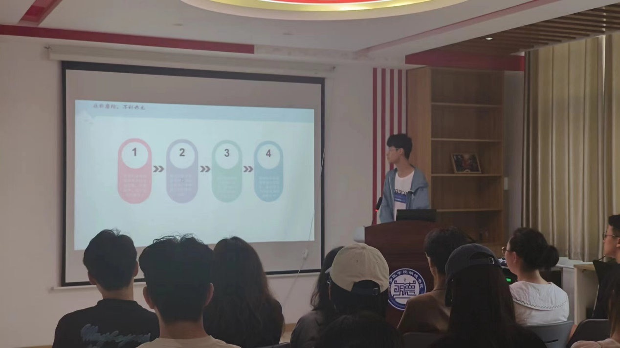 “执着于理想,纯粹于当下”是孙萌钦对学习的态度,也是对同学们的美好祝愿,孙同学从专业课学习、英文学习、课余生活、暑假收获四个方面分享了专业学习的具体方法、课后练习的app软件、阅读书籍的巧囊妙计以及暑假参加的志愿服务。
