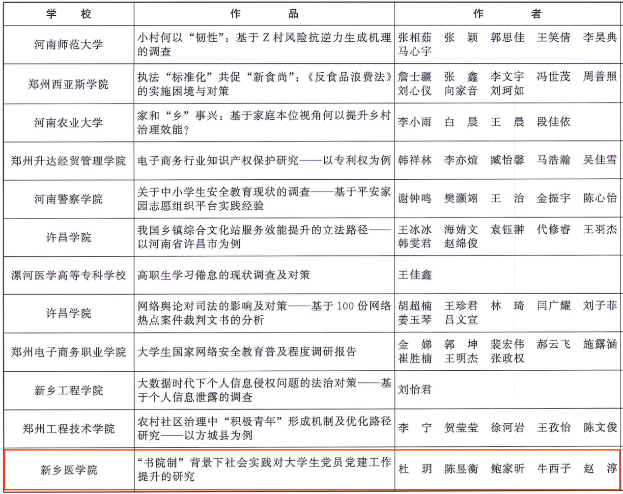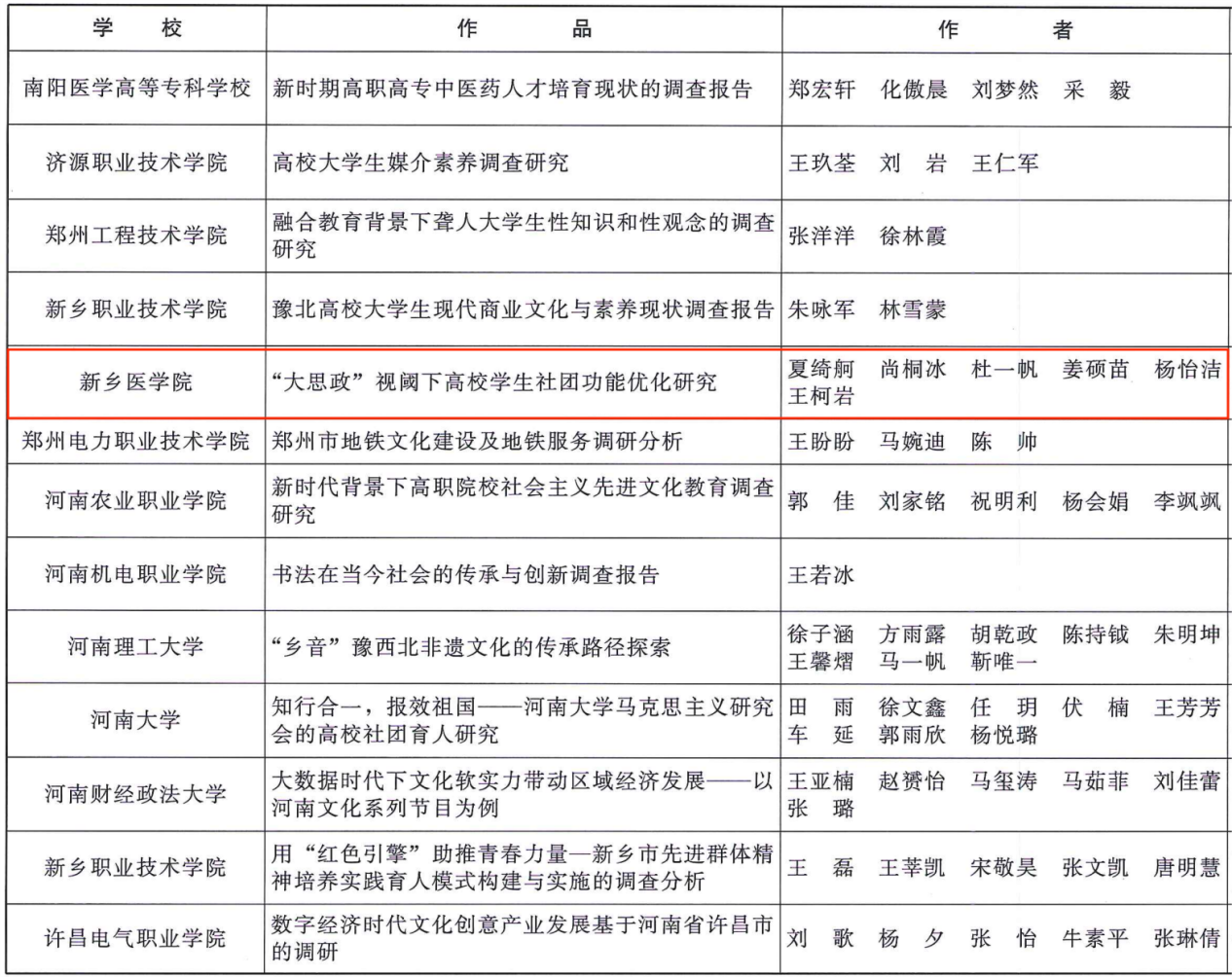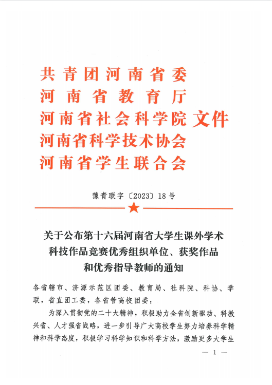 近日,由共青团河南省委、河南省教育厅、河南省社会科学院、河南省科学技术协会、河南省学生联合会共同举办的第十六届河南省大学生课外学术科技作品竞赛圆满结束。我院申报的《书院制背景下新时代医学生劳动观培育研究》等4项作品获奖,我院学生参与的《乳腺癌中E3泛素连接酶RNF187调控p53信号通路的机制研究》等6项作品获奖,实现了新的突破,展现了我院师生勇于创新、不惧挑战的精神。