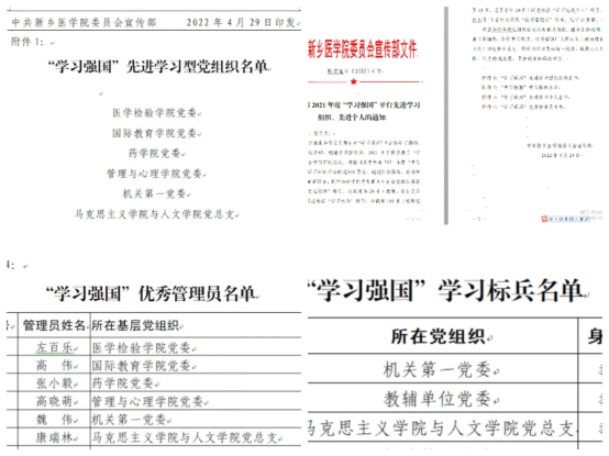 学校党委宣传部为进一步激发全体党员师生对“学习强国”平台的学习热情,营造争先进位意识,创造学习型校园,2021年开展了“学习强国”平台学习评比活动。在此次评比活动中,马克思主义学院与人文学院党总支获2021年度“学习强国”平台“先进学习型党组织”荣誉称号;孙国鹏同志获“学习强国”学习标兵荣誉称号;康瑞林同志获“学习强国”优秀管理员荣誉称号。