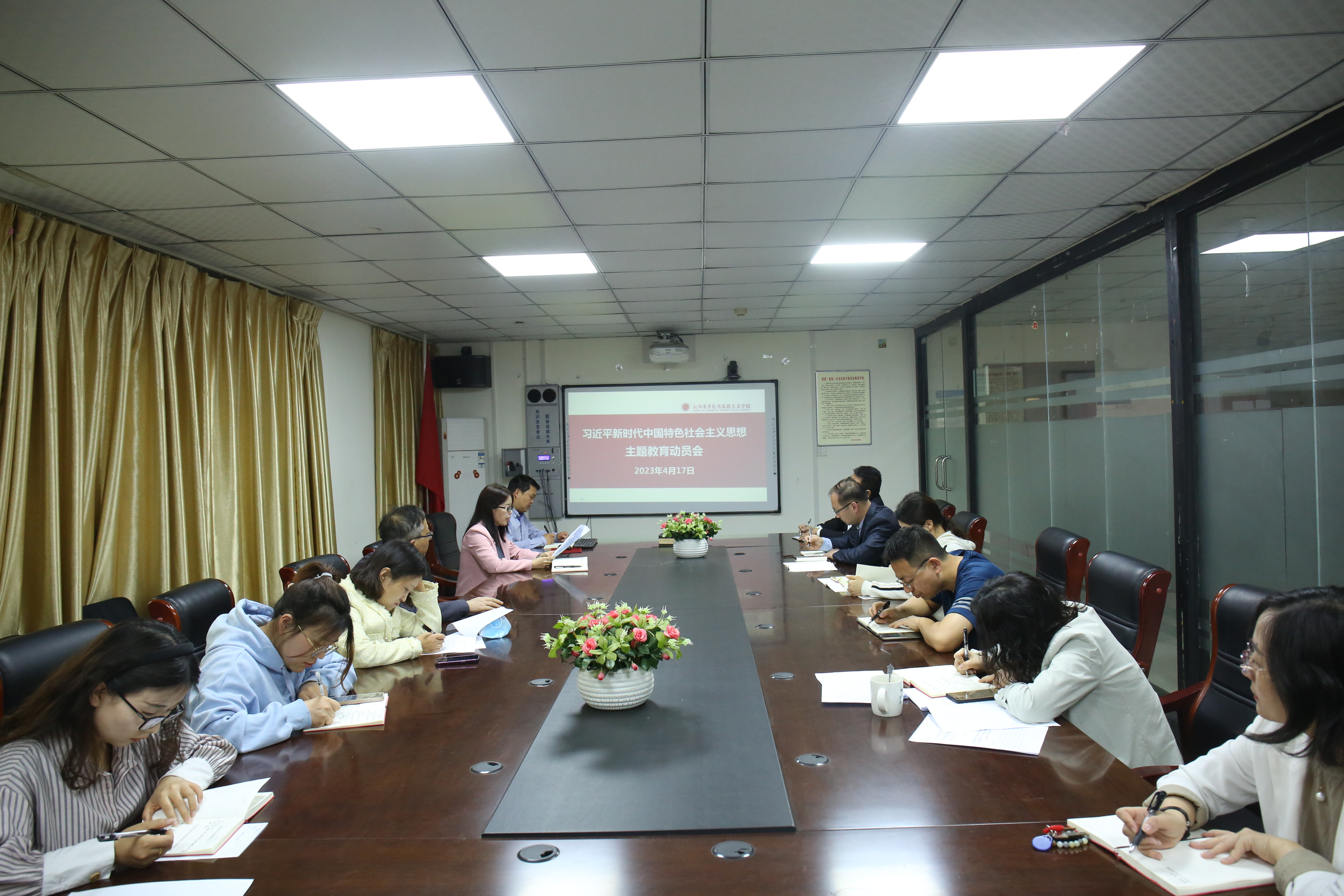 4月17日,我院在西校区综合楼六楼会议室召开学习贯彻习近平新时代中国特色社会主义思想主题教育动员会。总支副书记史伟、副院长朱培丽、副院长刘红及教研室主任、课程负责人参加会议。会议由史伟主持。
