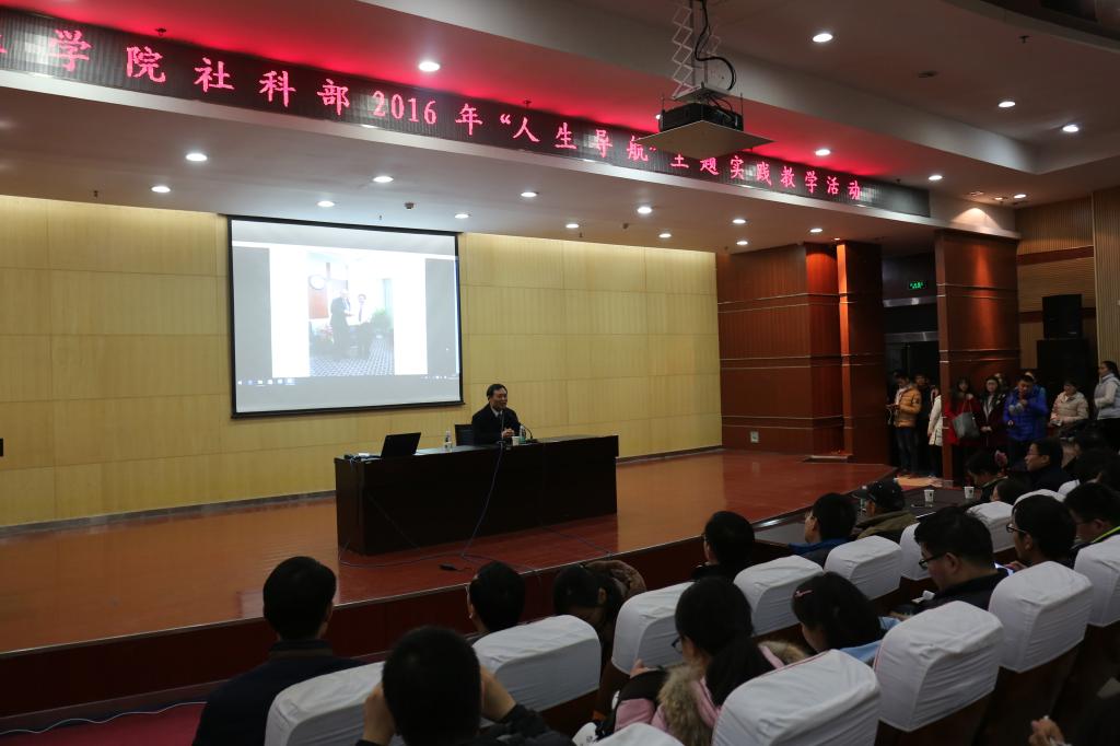 2016年11月23日晚18:30-20:30,由社会科学部主办,思想道德修养与法律基础教研室承办的第二期大学生“人生导航”主题实践教学活动在我校第一学术报告厅举行。本次活动中,我校解剖学和组织胚胎学教授郭志坤给大一新生上了一堂精彩的人生观教育课,他主讲的主题为“艰苦奋斗,成就自我”。