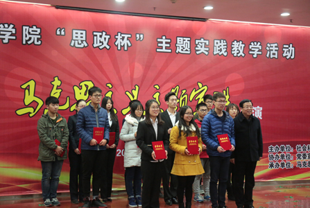 为深入学习贯彻习近平总书记系列重要讲话精神,全面贯彻高校思想政治理论课建设体系创新计划,激活思政主课堂,传播时代最强音,使大学生能够更好地认知、信仰、宣传、践行马克思主义, 12月1日晚18点-22点,我校“思政杯”主题实践教学活动——马克思主义主题宣讲展演在第三教学楼第一报告厅隆重举行,校党委副书记陈兴华、校党委副书记郝红军、副校长陈清江出席活动并为获奖选手颁奖。校党委办公室、校党委组织部、校党委宣传部、教务处等部门主要负责人与相关院系负责人和现场500余名师生共同观看了展演活动。展演活动由社会科学部主办,校党委宣传部、教务处协办,马克思主义基本原理概论教研室承办。