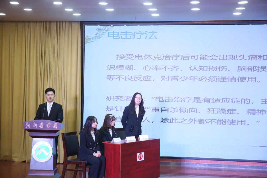 《马克思主义基本原理概论》教学团队按照学院推进思政课“专题授课+小班研学+实践展演”的“三位一体”课堂教学模式改革创新总要求,以“马克思主义主题宣讲”为抓手,切实培养学生自主学习、探究学习的能力,着力培育学生知信行相统一的优良品格。历经半年的精心筹划、课堂选拔,以及组织初赛和复赛,本次实践教学展演共选拔出9个班级进入年终决赛。比赛在《犯罪魔童是否应该降低刑事责任年龄》的法理追寻中拉开帷幕,情景剧《护士处方闹杏林》、《偷窥者》,以马克思主义辩证思维审视事物发展的前进性与曲折性关系,《潘书记的扶贫之路》,彰显“人民创造历史”、“劳动创造未来”的时代主题,相声《天价孤儿药是否合理》、《中西医:和而不同》,观照当代中国医疗卫生事业发展的人民立场、中国特色、世界视野,具有辩论色彩的《网瘾是否应被列为精神病》、《青少年犯罪年龄应不应该提前》、《崔雪莉自杀之真相》等,展现了新医学子立场坚定、思维缜密、勤学善思、妙语连珠的时代新人形象。