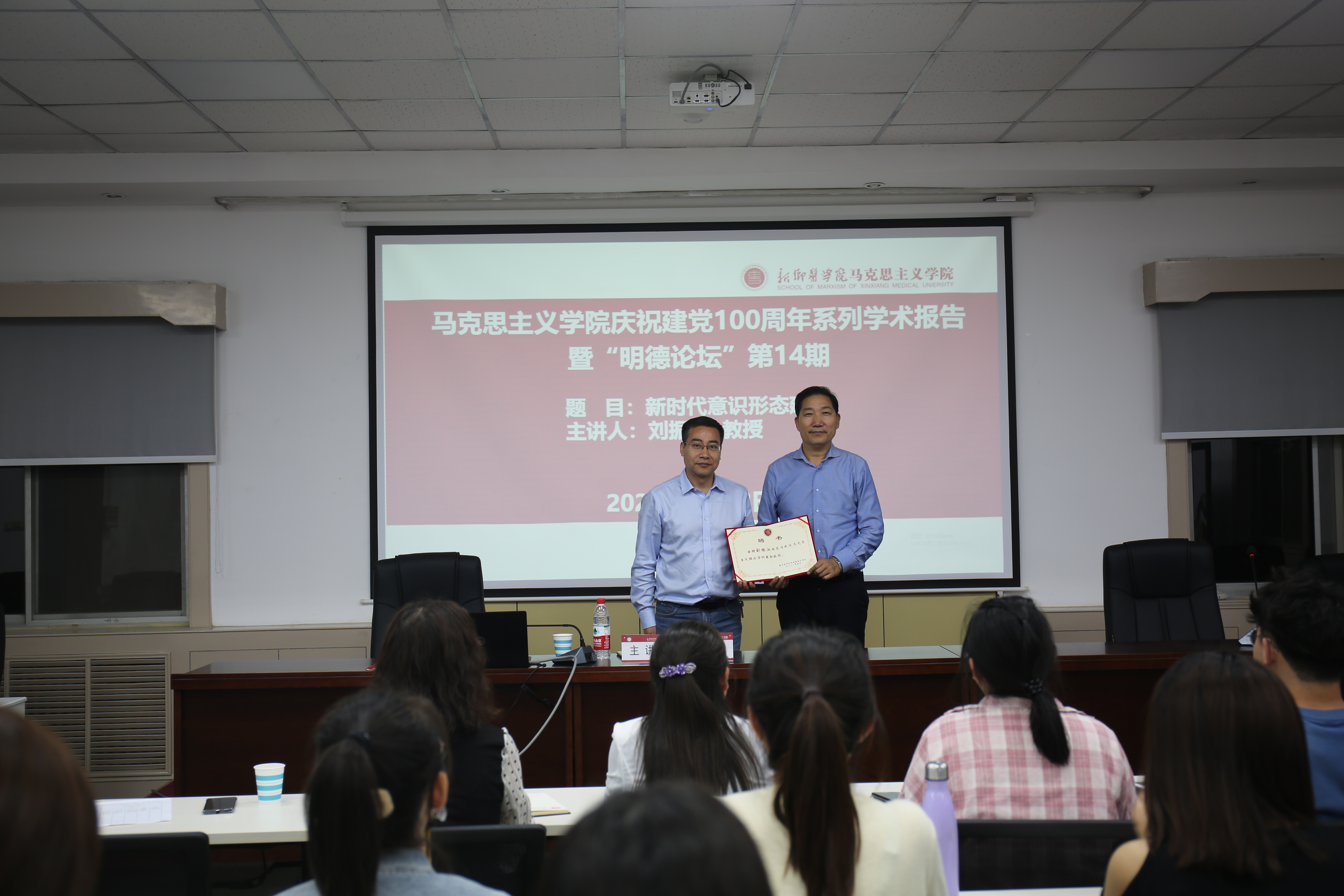 学术报告在南校区学工楼406会议室举行,我院教师代表、全体研究生和本科生青马班学员共同参加。刘教授从意识形态工作及其工作责任制、各种错误思潮批判、主流意识形态的巩固强化三个方面,讲授了新时代意识形态建设问题。报告深入浅出、高屋建瓴、内容详实、语言朴实,既有丰富的案例支撑,又有深厚的理论思维。报告结束后,我院院长戎华刚教授宣布聘任刘教授为我院兼职教授,并为刘教授颁发聘任证书。