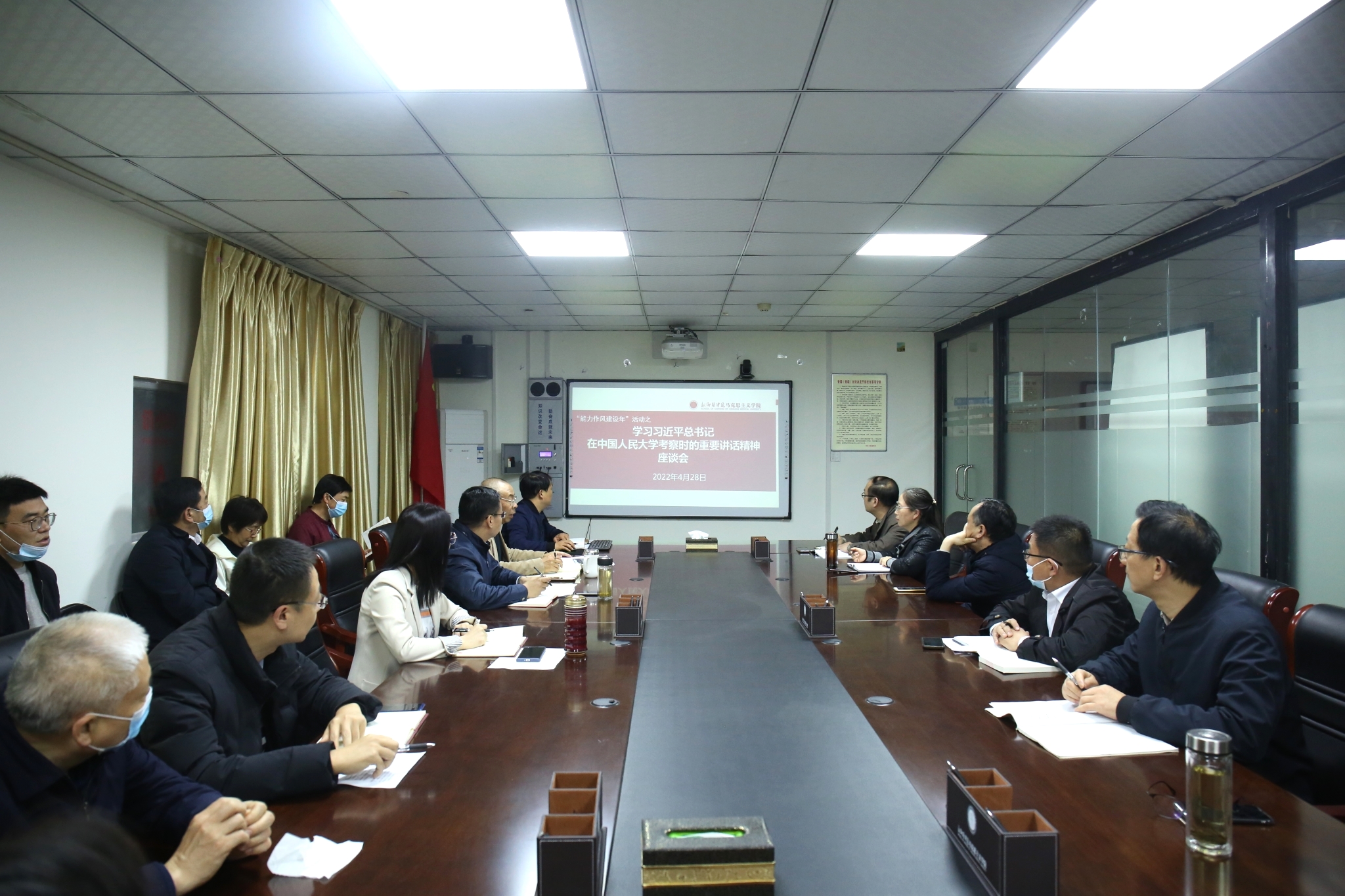 4月28日下午 ,在西校区综合楼六楼会议室,我院召开学习习近平总书记考察中国人民大学重要讲话精神座谈会,总支书记杨冠英、院长戎华刚、总支副书记史伟、副院长冯秋季以及全体教职工参加座谈会,会议由杨冠英主持。