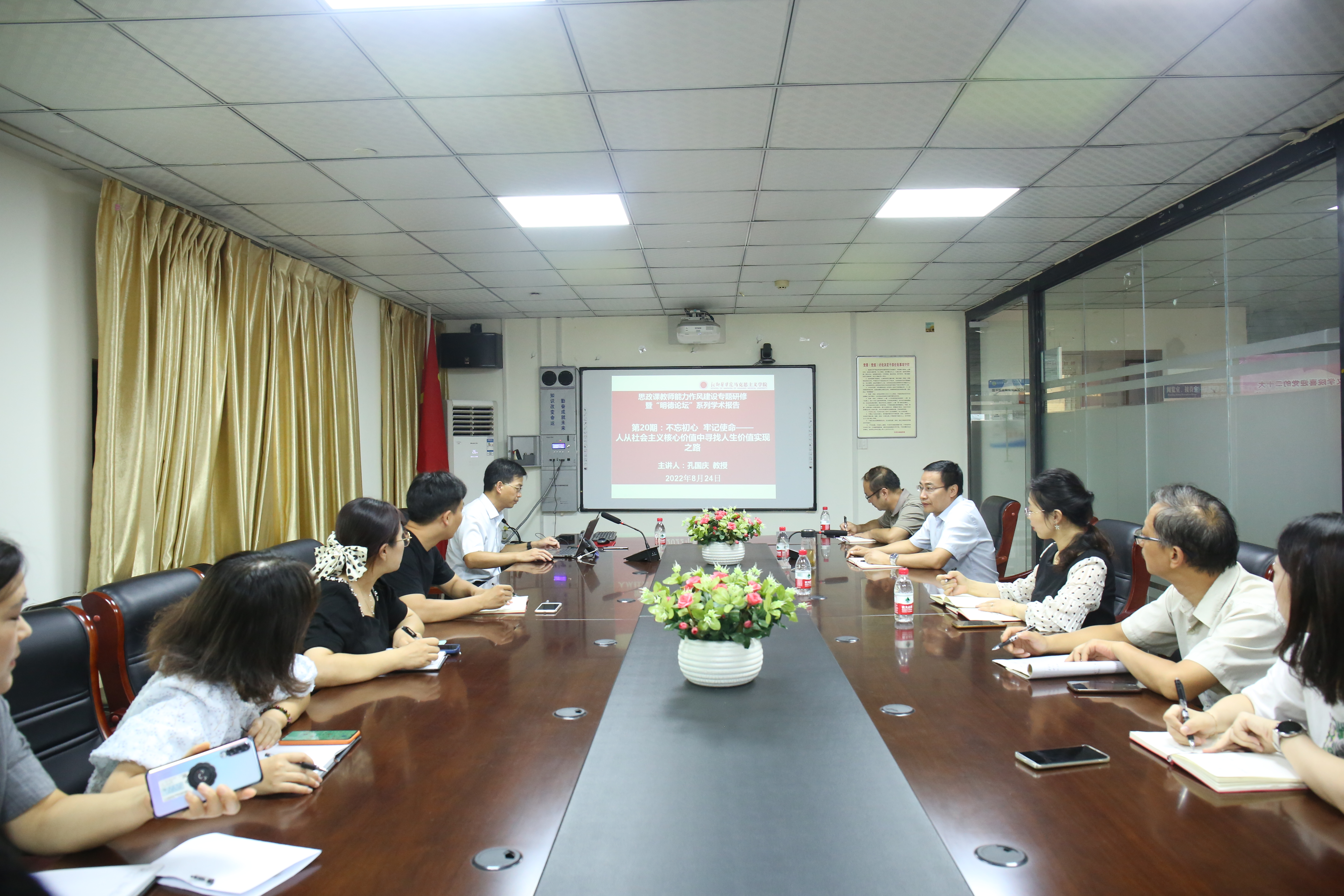 为了迎接党的二十大胜利召开,8月24日下午,我院在西校区综合楼六楼会议室举行思政课教师能力作风建设专题研修暨第20期“明德论坛”学术报告会。本次论坛特邀南阳农业职业学院校长孔国庆教授作题为《不忘初心、牢记使命——从社会主义核心价值观中寻找人生价值实现之路》的主题报告,我院党政班子成员及全体思政课教师参加,院长戎华刚主持报告会。