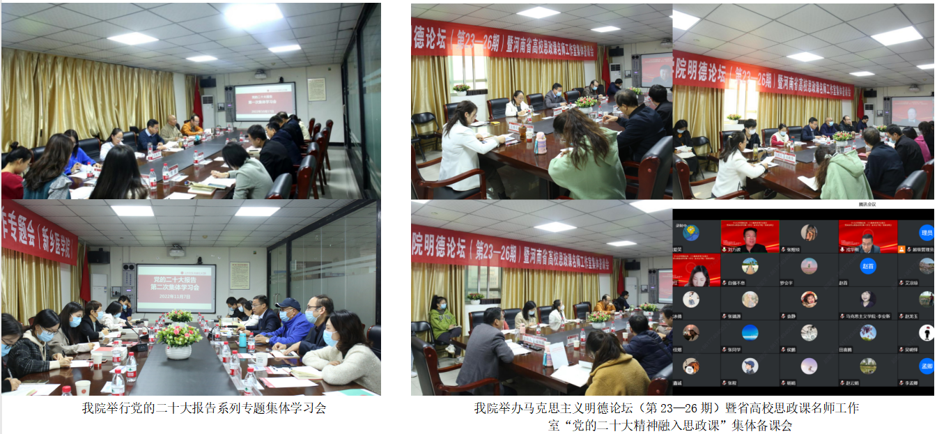 “融入”浸透。我校党委书记、校长任文杰教授采用云端方式为2021级本科生讲授思政课。任文杰教授利用马克思主义基本原理课堂这一主阵地,讲深讲透讲活了党的二十大报告中关于坚定历史自信、团结奋斗的重要论述;与校党委宣传部合作举办“喜迎党的二十大,深学细悟谋创新”主题征文活动,切实探索将党的二十大精神创新性融入的路径,活动评选出一等奖2篇、二等奖3篇、三等奖4篇及优秀奖若干;组织全体思政课教师观看“党的二十大精神融入高校思政课”系列学习活动,让党的二十大精神融入思政课教学的各个环节;组织马克思主义理论重点学科培育专项计划,号召全体思政课教师深入研究、阐释及宣传党的二十大精神,力争在权威著作、高水平论文、高级别课题等方面再创佳绩;组织2021级硕士研究生学位论文开题报告会,鼓励全体研究生认真学习领会党的二十大精神,切实将其有机融入学位论文的选题和写作中,以中国化时代化马克思主义引领自身学术成长。