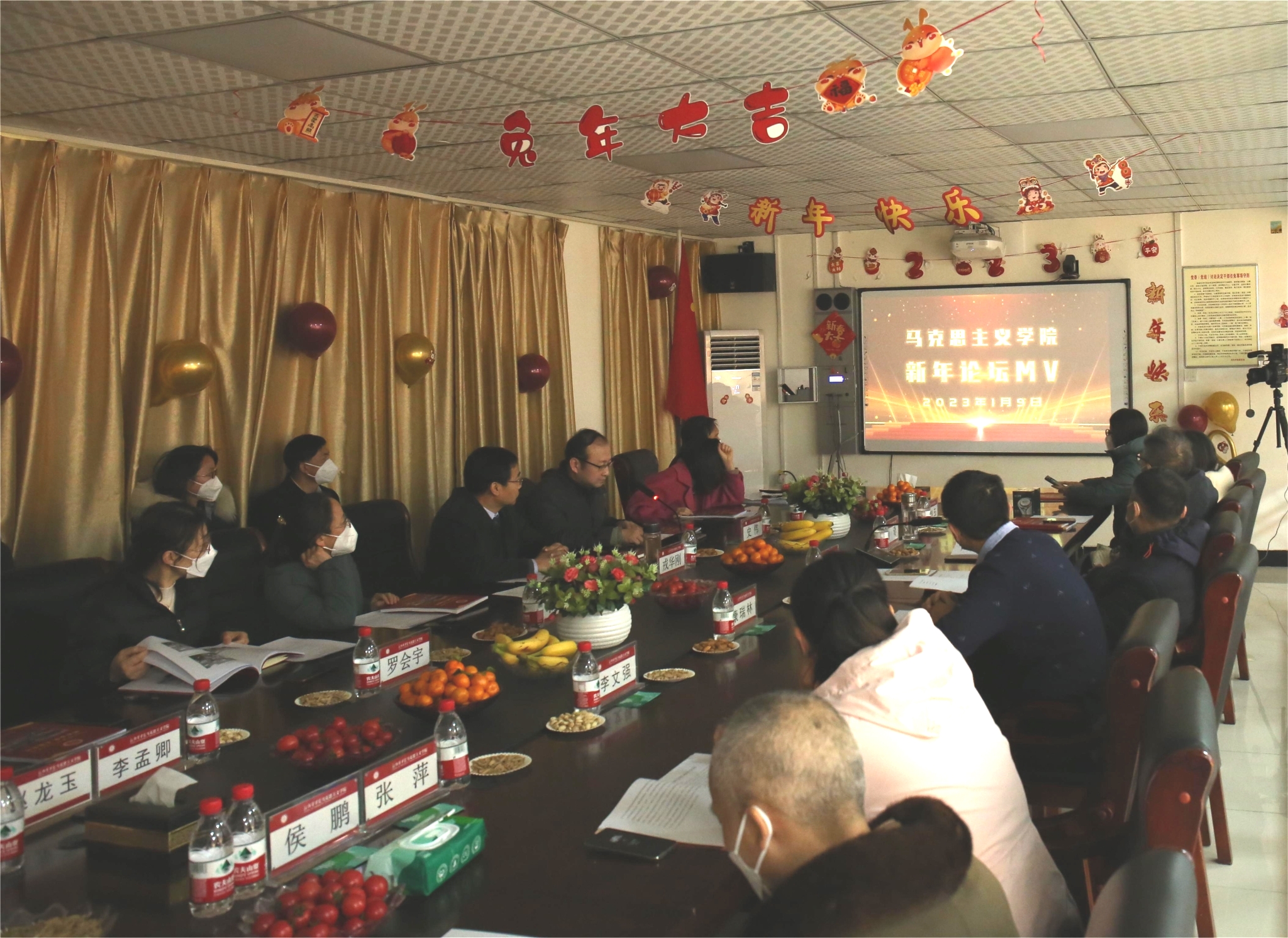 论坛伊始,戎华刚代表学院对全体教职工一年来的辛勤付出表示衷心的感谢,并致以诚挚的问候和新年的美好祝福。他总结了学院过去一年的工作与取得的成绩,并希望在新的一年里,全体教师“敢”字为先,“干”字当头,敢闯敢干,共同奋斗,创造出更加优异的成绩。接下来,全体教师观看马克思主义学院2023年新年论坛视频,以“初心”、“精耕”、“奉献”“传承”为主题回顾了去年各项工作的精彩瞬间。