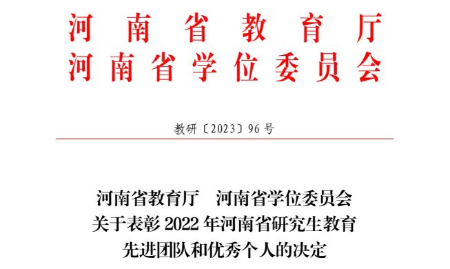 近日,河南省教育厅、河南省学位委员会下发了《关于表彰2022年河南省研究生教育先进团队和优秀个人的决定》,我院荣获2022年河南省研究生教育工作优秀团队。
